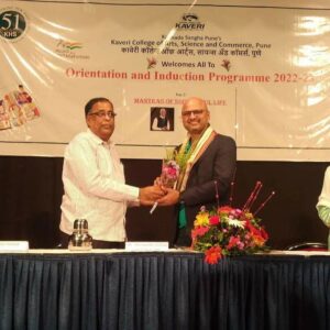 Principal Dr. Ashok Agarwal, Vice Principal Dr. Mukta Karmarkar, Guest Speaker Dr. Ashish Tawkar-Leadership Mindset Coach, Pune and Motivational Speaker Dr. Sharda Bapat,Career coach Mr. Anirudh Pathak were present for this programme. Principal Dr.Ashok Agarwal welcomed all the students in his welcome speech and congratulated them for choosing Kaveri College for their educational journey for the next three to five years.