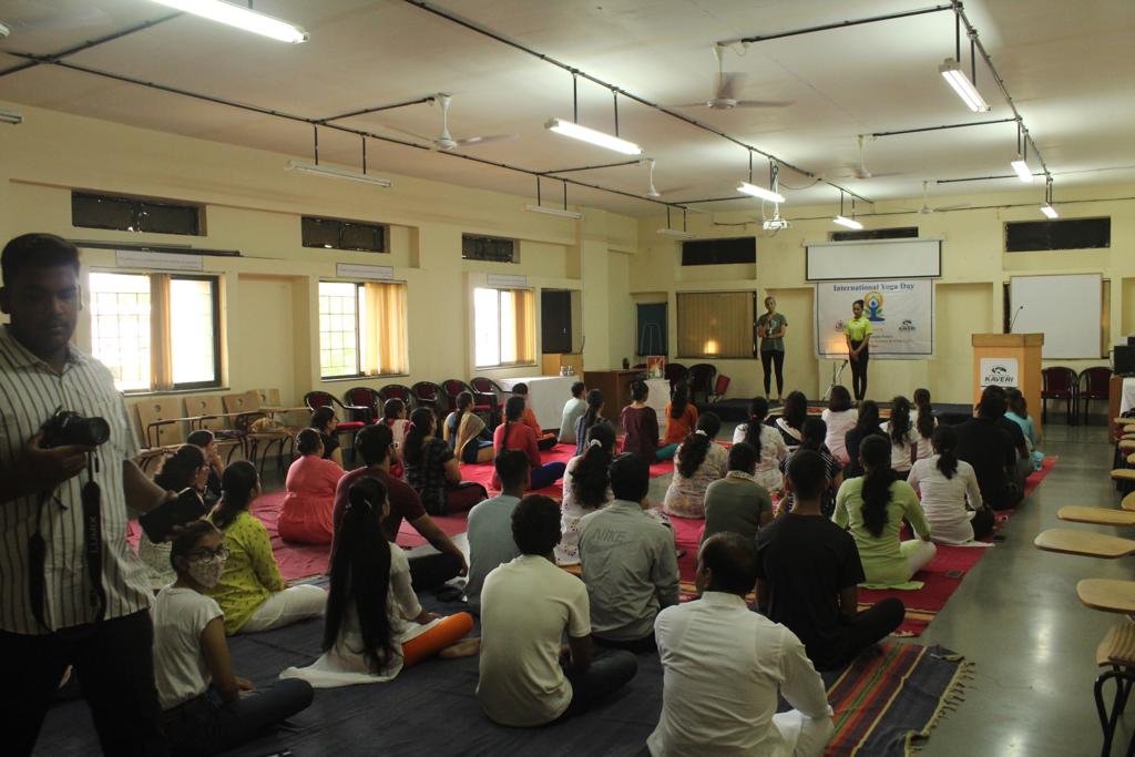 International Yoga Day has been celebrated all over the world on 21st June every year since 2015. On the occasion of the 8th World Yoga Day- 21st June 2022, Kaveri College organized a special programme for students and professors. With respect to the significance of mental, physical and emotional effects of the Corona Pandemic on the human body, the theme for this year’s International Yoga Day was ‘Yoga for Humanity’. Vice principal Dr. Mukta Karmarkar welcomed the yoga instructor Smt. Kalyani Tulpule. Mrs. Tulpule said that It is important to include yoga in your life for a better lifestyle. Yoga keeps the body healthy and relieves mental stress. She explained the benefits of regular yoga practice and certain rules while doing yoga to students and professors of Kaveri college and guided them with demonstrations. The event organizer and moderator Dr. Anand Buddhikot proposed a vote of thanks to the audience. All the teachers, non-teaching staff and students of the college actively participated in the event.
